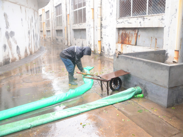 8月10日,台风带来的强降水汹汹而至。公司党委书记、董事长王力民到公司各处巡查督导,防汛应急小组成员各就各位,各部门按职能分工,全力以赴投入到鏖战“利奇马”这场硬仗当中。为了防止雨水进入生产车间,各车间在提前安装好防水挡板、垒砌防汛沙袋基础上,每个出入口都安排专人看护,对出现漏水、漏电等情况及时采取措施。在生产现场,相关设备人员及时检查电源柜、防汛泵等设备,保障正常运行;提前增加的安全照明装置,有效增强了台风期间的现场亮度。针对室外积水积水较深这一情况,开启防汛泵,将积水排入雨水管道,对积水超过100㎜后安插警示标识,并且摆放防汛凳,保障员工安全出入;对外围排水口及下水管道及时冲洗、清理,以避免厂区积水影响到生产运行。