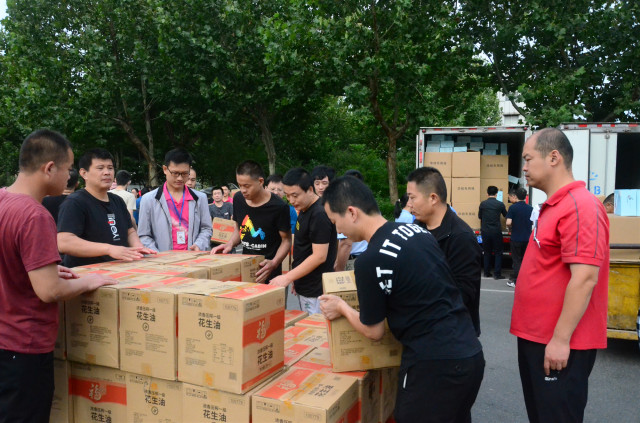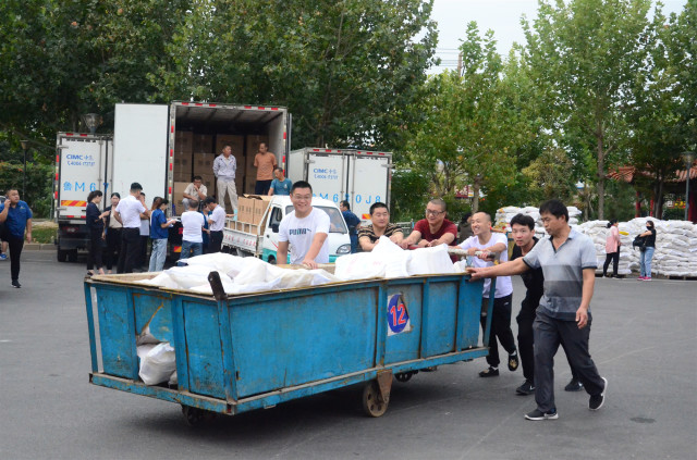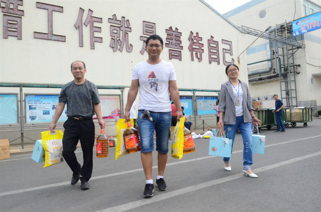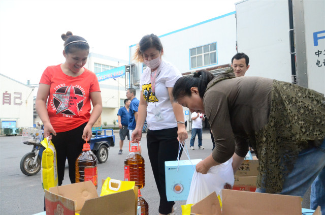 日前,在传统的中秋佳节来临前夕,公司为员工准备了花生油、小米、月饼等节日慰问品,以体现对员工倾情奉献企业发展的慰问与关爱。图为员工领取节日慰问品的情形。