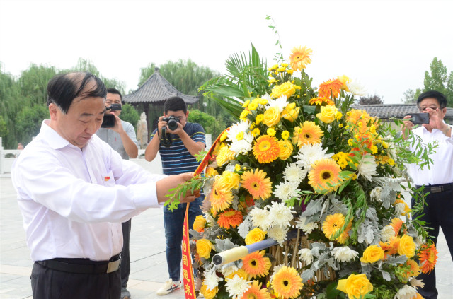 向周恩来总理骨灰撒放地纪念碑敬献花篮,拜谒纪念碑。