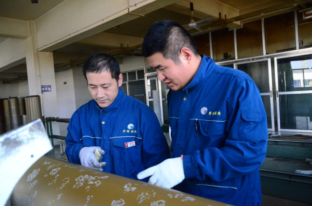 图为花布车间制网工序的张海亮(左)与张彬彬在安装闷头前,再次查看验证镍网质量。