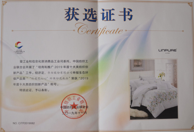 近日,中国纺织工业联合会受工业和信息化部消费品工业司委托,开展了“培育和推广2019年度十大类纺织创新新品”工作,公司的“天然抗菌汉麻超柔床品”、“竹韵花沁心环保印花床品”荣获“2019年度十大类纺织创新床品”称号。