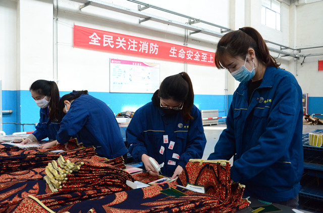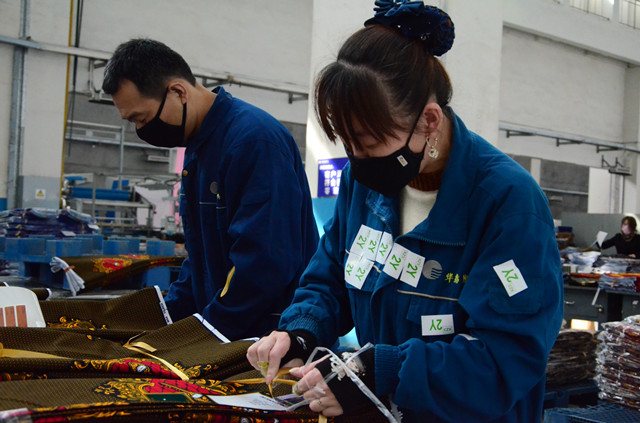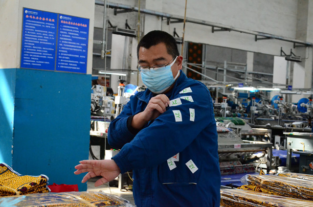 在公司印染整装车间,员工们为了使工作效率更高,将商标的标签事先集中临时粘在工装的胸前、衣袖等处,干起活来不仅顺手,而且提高了产品包装速度。他(她)们很阳光地调侃说,这是特殊的服“饰”呢!