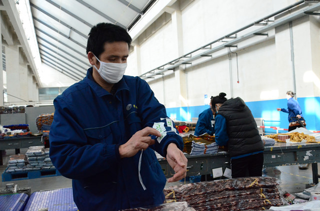 在公司印染整装车间,员工们为了使工作效率更高,将商标的标签事先集中临时粘在工装的胸前、衣袖等处,干起活来不仅顺手,而且提高了产品包装速度。