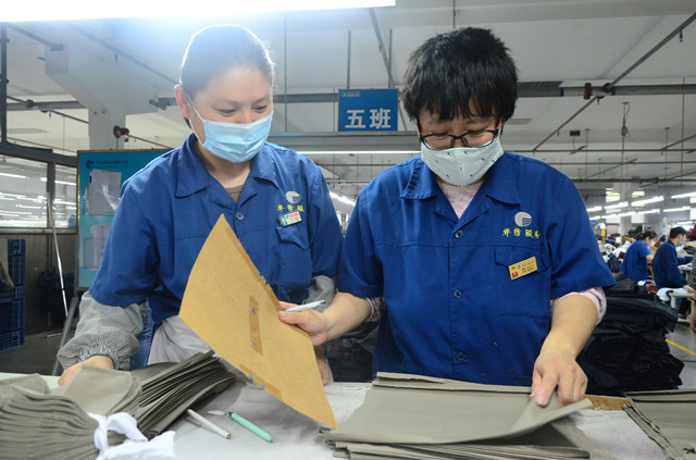 导读:服装车间点位工褚翠叶和杨春芳每天的日常工作,是一次次重复将底板对应在需要进行定位的生产材料上,并用记号笔标定生产加工的具体位置。