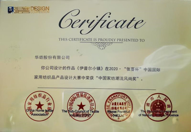 导读:9月2日,以“潮流·生活”为主题的2020·“张謇杯”中国国际家用纺织品产品设计大赛颁奖盛典在江苏南通举行。公司家纺作品《伊普尔小镇》,荣获“中国家纺潮流风尚奖”。