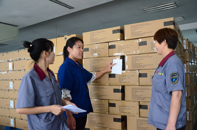 图为服装车间计划管理员陈燕红(中)在与质量部质检人员一起,对接即将发出的出口产品。