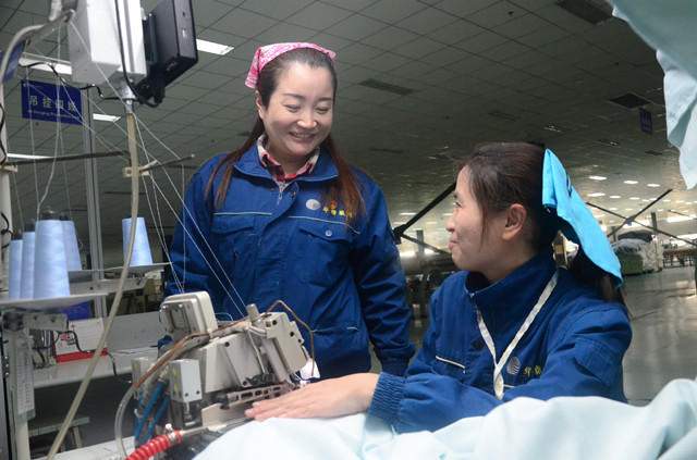 图为姚俊燕(左)在与五线缝纫工王冬梅交流新货单操作要点