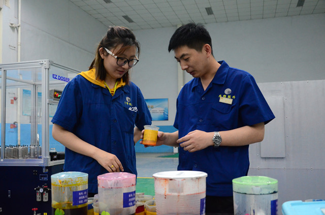 张甜甜(图左)和张新华(图右)二人,是多年来在公司花布车间从事专业技术工作的基层科技工作者,他们每天都为车间生产的印花产品精心调制着颜色。与其二人一样,公司从事颜色调配的专业技术人员,每天都要完成一定数量的颜色调制;以花布车间为例,每人每天完成颜色调制在15-30个之间,并符合四级以上印花符样标准。他们用自己的坚守与付出,演绎着一道旖旎多彩的风景线。