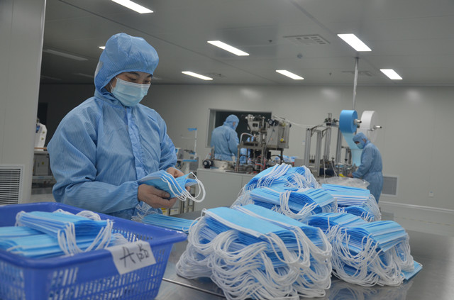 图为公司清洁车间员工生产口罩的情形。