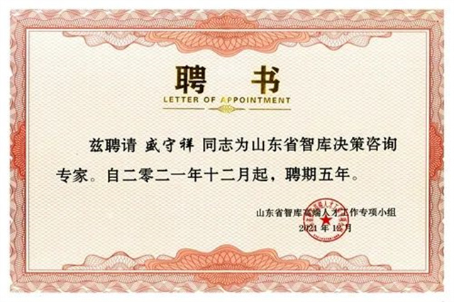 导读:近日,接山东省智库高端人才工作专项小组办公室通知,公司董事长盛守祥入选2021年山东省智库高端人才,获聘经济建设领域山东省智库决策咨询专家。
