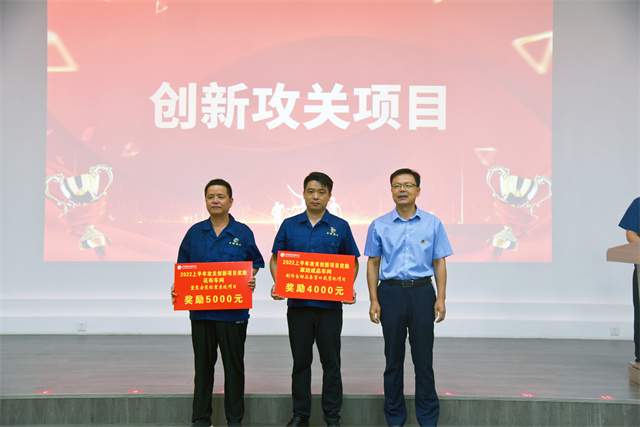会上,李风明宣读了公司对2022年上半年度CQI项目、创新攻关成果等表彰决定;盛守祥为CQI项目代表、创新攻关一等奖项目代表颁发奖励牌,总经理闫英山为各车间创新攻关其他受奖项目代表颁发奖励牌,李风明为质量之星、效率之星、工艺操作之星受奖代表颁发荣誉证书,公司安全总监孙中然为现场6S之星、精益提案之星受奖代表颁发荣誉证书。会议由公司团委书记陈冰主持。