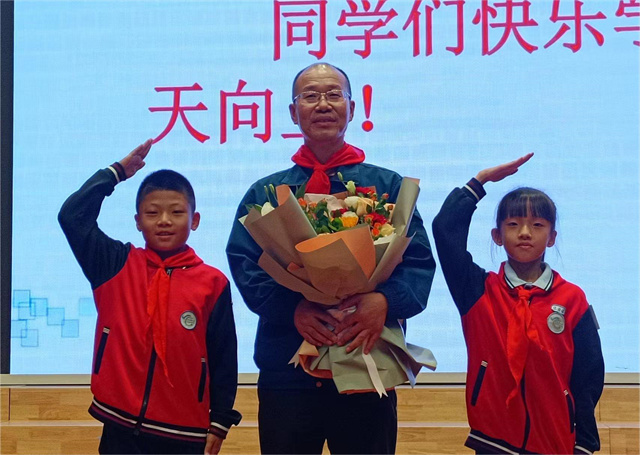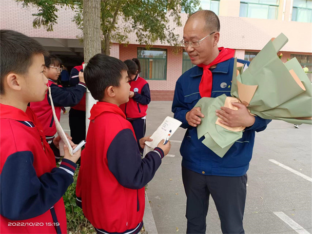 在课堂结束后的采访环节中,同学们踊跃提问,赵奇生回答了同学们的问题并且鼓励同学们“学习如逆水行舟,不进则退,要不断学习,不断进步。”活动最后,学生代表为赵奇生戴上红领巾并向他献花。