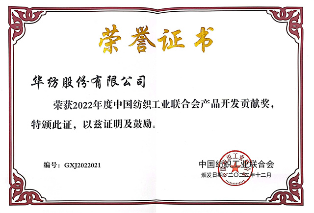 近日,中国纺织工业联合会发布《关于授予2022年度中国纺织工业联合会产品开发贡献奖等荣誉称号的决定》,公司获评“2022年度中国纺织工业联合会产品开发贡献奖”荣誉称号。