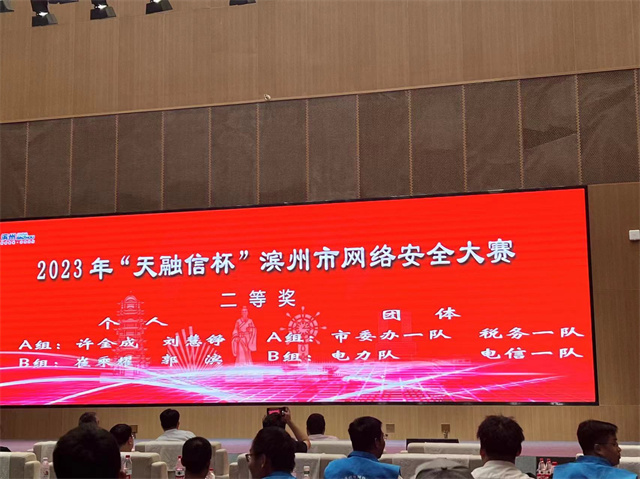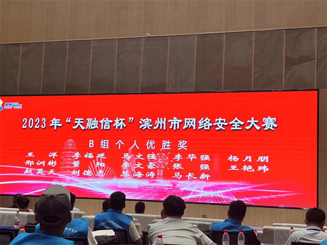 7月21日,2023年“天融信杯”滨州市网络安全大赛决赛在渤海先进技术研究院举行,公司代表队最终获团体三等奖,公司互联信息部信息中心信息安全管理员崔乘耀获个人二等奖,公司互联信息部信息中心软件开发技术员邢训彬、王艳玮获个人优胜奖。