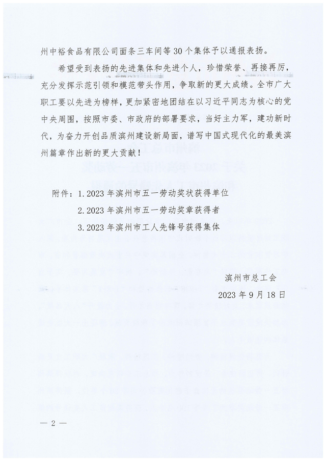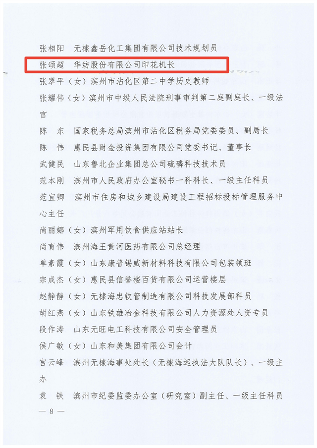 近日,滨州市总工会发布了“关于2023年滨州市五一劳动奖和滨州市工人先锋号的通报”,对获得滨州市五一劳动奖状的无棣鑫岳燃化有限公司等26个单位,获得滨州市五一劳动奖章的丁涛等190名个人,获得滨州市工人先锋号的滨州中裕食品有限公司面条三车间等30个集体予以通报表扬。其中,公司花布车间印花机机长张颂超荣获2023年滨州市五一劳动奖章。