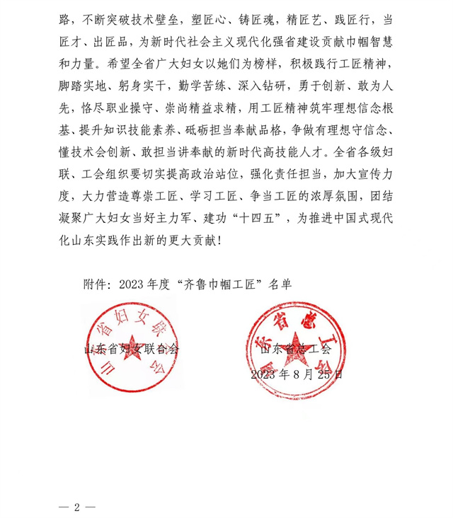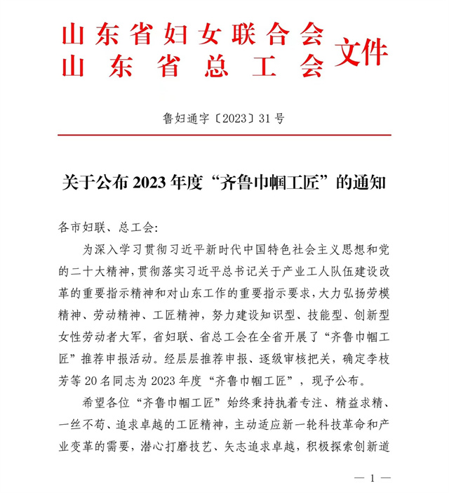 导读:近日,山东省妇女联合会、山东省总工会发布了“关于公布2023年度‘齐鲁巾帼工匠’的通知”,公司染化料配制工郭冬梅名列其中。