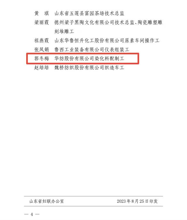 为大力弘扬劳模精神、劳动精神、工匠精神,努力建设知识型、技能型、创新型女性劳动者大军。近日,山东省妇女联合会、山东省总工会发布了“关于公布2023年度‘齐鲁巾帼工匠’的通知”,公司染化料配制工郭冬梅名列其中。