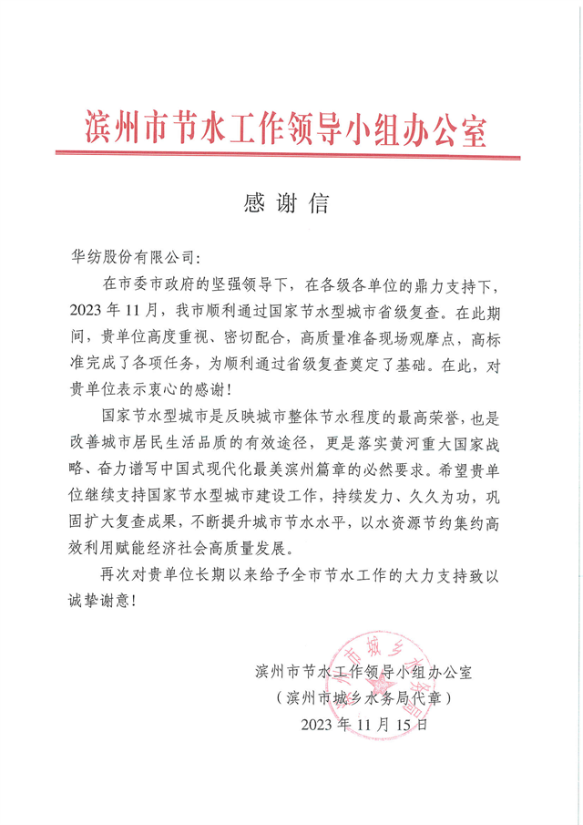 近日,滨州市节水工作领导小组办公室向公司发来一封感谢信,信中指出:“2023 年11月,我市顺利通过国家节水型城市省级复查。在此期间,贵单位高度重视、密切配合,高质量准备现场观摩点,高标准完成了各项任务,为顺利通过省级复查奠定了基础。”
