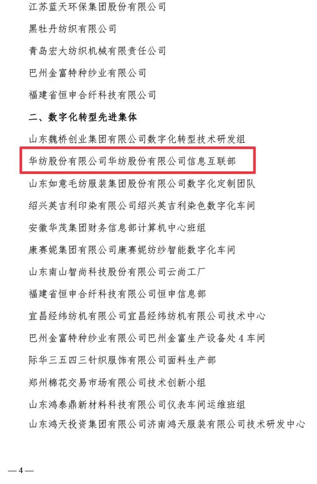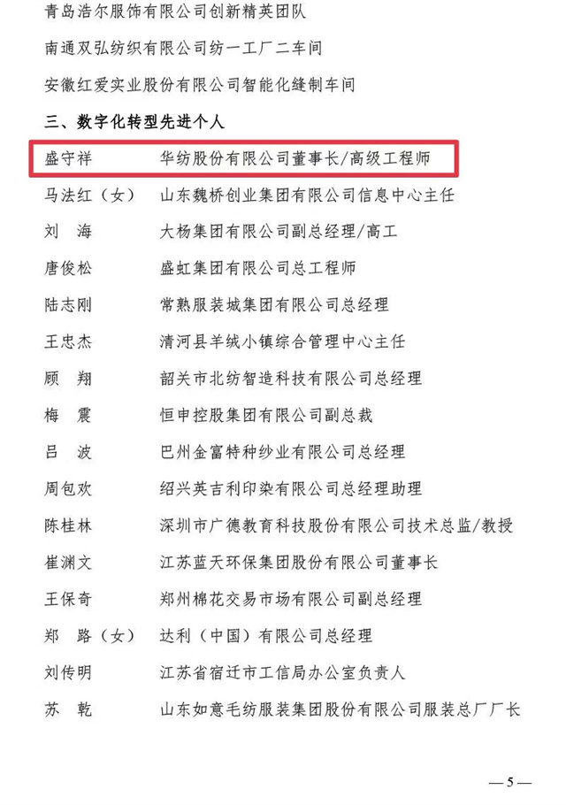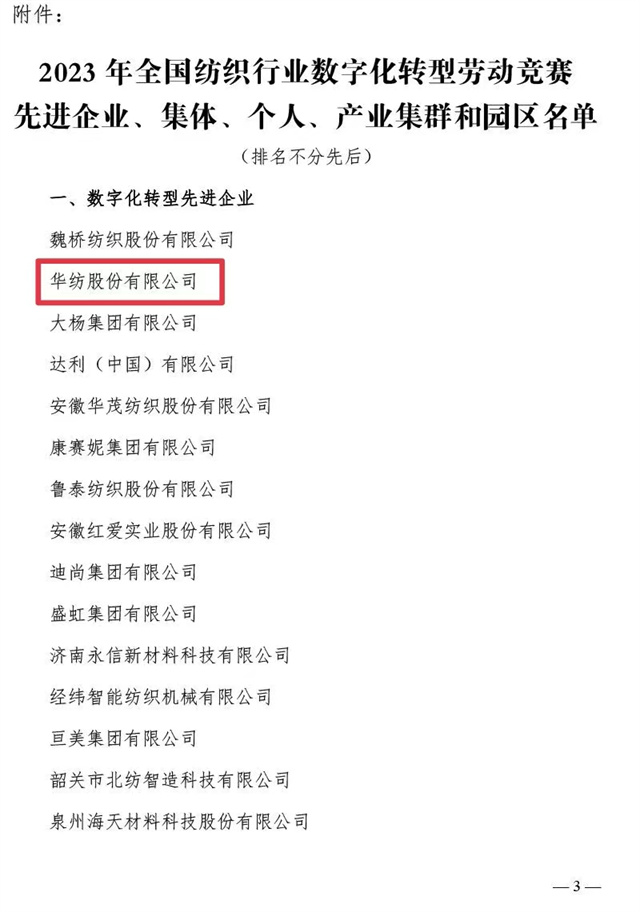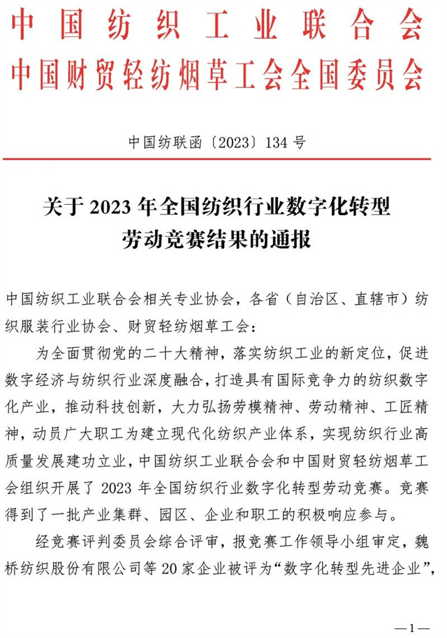 近日,中国纺织工业联合会、中国财贸轻纺烟草工会全国委员会联合发布了《关于2023年全国纺织行业数字化转型劳动竞赛结果的通报》,公司凭借2023年在数字化转型方面的不断探索与创新被评为“数字化转型先进企业”,公司信息互联部被评为“数字化转型先进集体”,公司党委书记、董事长盛守祥先生被评为“数字化转型先进个人”。
