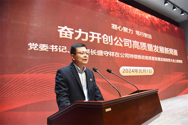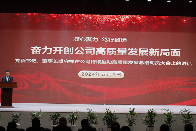 会议最后,盛守祥作了题为《凝心聚力 笃行致远 奋力开创公司高质量发展新局面》的工作报告。报告全面总结梳理了公司过去一年的工作,深刻剖析了实际工作中的问题,为新阶段工作提出了指导性意见。2024年,公司主要工作概括为四个方面:一是坚持党建引领,夯实政治保障;二是坚持绿色发展,抓好环保安全;三是以架构之变、价值作风之变、绩效之变、造血止血之变、团队之变开启变革之年,全面突破在望;四是在“产业链、资金链、人才链、创新链、供应链”上持续发力,共建百亿家园。