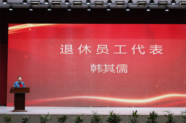 盛守祥为退休员工代表颁发荣誉证书,退休员工韩其儒代表80位退休同志做表态发言。