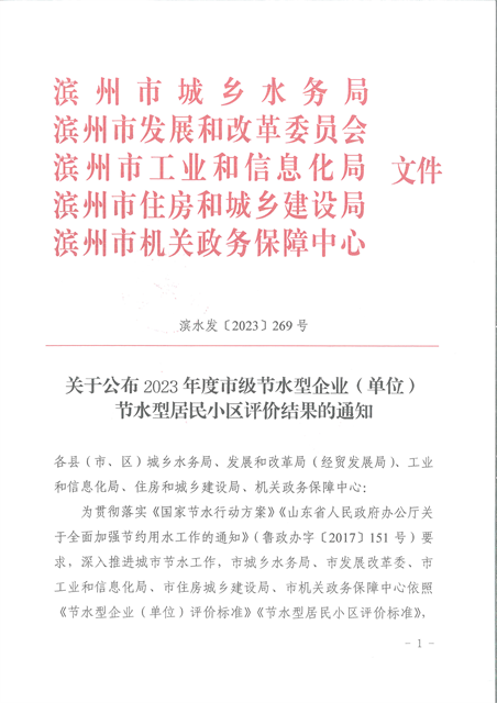 近日,滨州市城乡水务局、滨州市发展和改革委员会、滨州市工业和信息化局、滨州市住房和城乡建设局、滨州市机关政务保障中心发布了《关于公布2023年度市级节水型企业(单位)、节水型居民小区评价结果的通知》,经综合评价,公司达到市级节水型企业(单位 )、节水型居民小区标准要求,获评2023年度滨州市节水型企业。