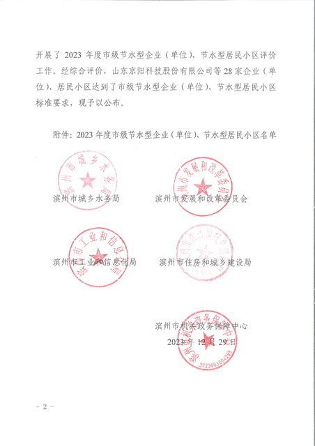 喜报!公司获评2023年度滨州市节水型企业