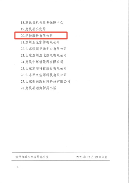 2023年,在全国纺织行业绿色发展劳动竞赛中,公司荣获节水标杆企业;在滨州市创建国家节水型城市省级复查工作中,公司高质量、高标准完成各项工作任务,为顺利通过省级复查奠定了基础。