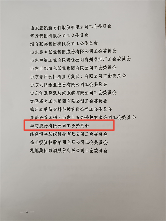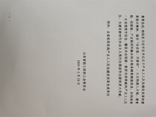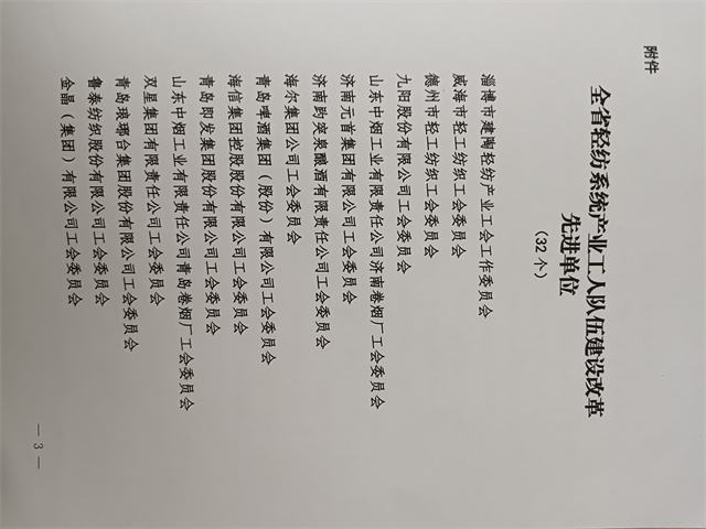 近日,省轻工纺织工会三届四次全委会暨全省轻纺系统产业工人队伍建设改革推进会议在济南召开。会上公布了全省轻纺系统产业工人队伍建设改革先进单位名单,公司工会委员会名列其中。