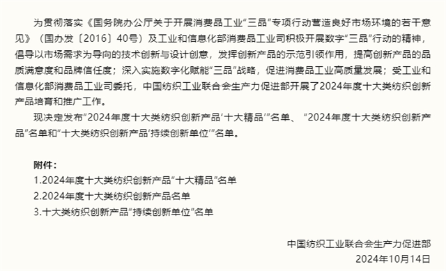 导读:近日,中国纺织工业联合会生产力促进部发布了“2024年度十大类纺织创新产品‘十大精品’”名单、“2024年度十大类纺织创新产品”名单和“十大类纺织创新产品‘持续创新单位’”名