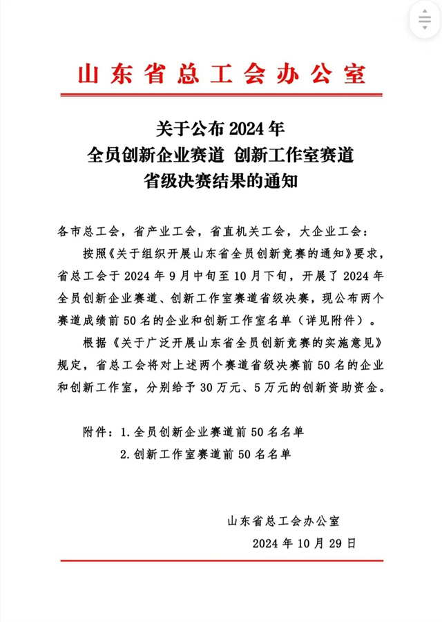 近日,山东省总工会公布了2024年全员创新企业赛道、创新工作室赛道名单,在全员创新企业赛道,公司成功入选!
