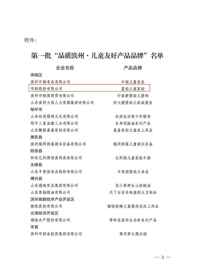 近日,市发展改革委、市妇联、市市场监管局联合发布第一批“品质滨州·儿童友好产品品牌”名单,公司蓝铂儿童家纺凭借卓越的品质与贴心的设计成功入选。