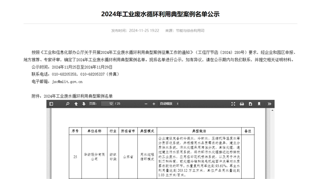 导读:近日,工业和信息化部发布了2024年工业废水循环利用典型案例名单,含58个工业废水循环利用典型案例。公司用水过程循环模式成功入选名单,水重复利用率达到93.61%;再生水利用量达到