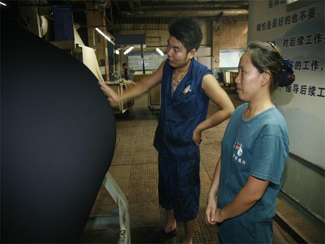 图为面三车间丙班2#拉幅机挡车工李良(左)与出检工崔月华,在查看产品质量。
