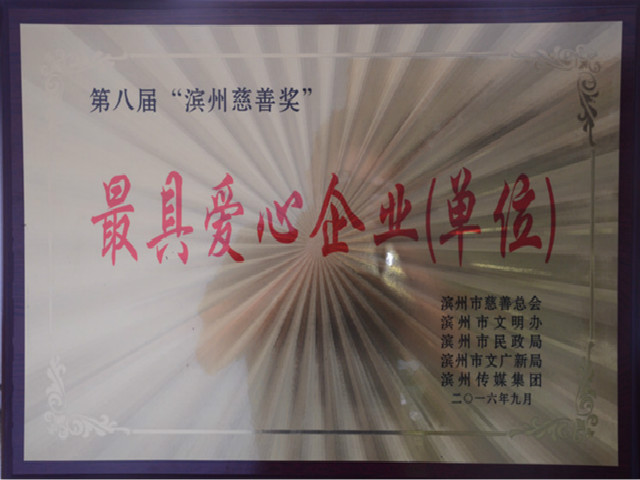 近日,由滨州市慈善总会、市精神文明建设委员会办公室、市民政局、市文化广电新闻出版局、滨州传媒集团等联合举办的第八届“滨州慈善奖”评选表彰活动圆满结束,公司以对慈善事业的突出贡献,荣获“最具爱心企业(单位)”称号。