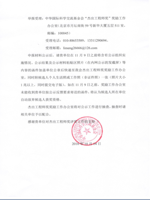 举报受理:中国国际科学交流基金会“杰出工程师奖”奖励工作办公室(北京市月坛南街59号新华大厦五层511室,邮编:100045)