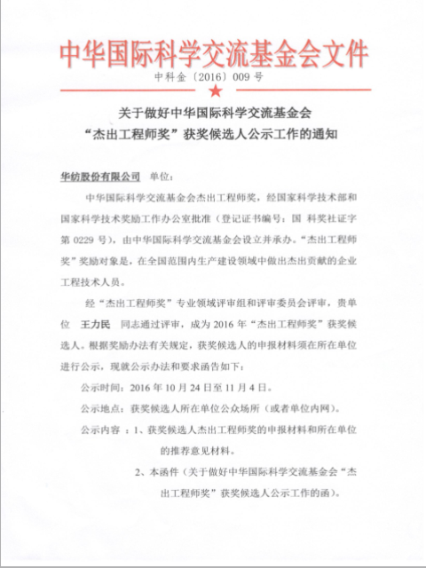导读:关于中华国际科学交流基金会“杰出工程师奖”获奖候选人王力民同志的公示
