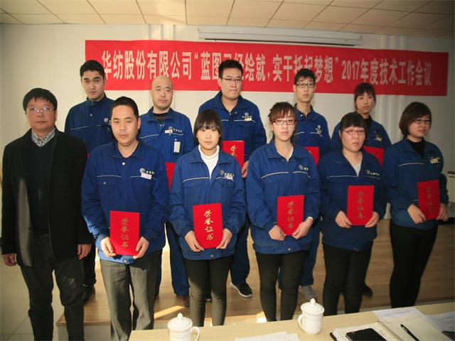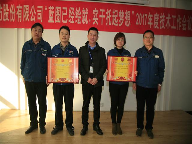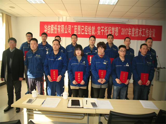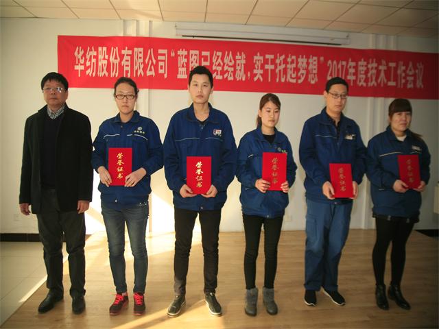 2016年,公司以技术创新、技术进步为带动,持续推进精益化生产和标准化操作与管理。技术委员会以技术人员的综合素质提升为重点,进一步强化了技术人员的选拔、培养与激励,优化了技术队伍的知识结构和专业技能,公司整体技术创新能力与水平得到显著提高。在公司2016年技术人员打单色样、大小样差距实验、拼色样、打样技能等一系列竞赛评比工作中,涌现出一批表现突出的技术人员。为此,公司技术委员会根据相关评比原则及条件,评比出单色样、打样技能方面团体奖2个,获奖技术人员29名。总经理闫英山为优秀团队颁发奖状,总工程师罗维新为获奖的专业技术人员颁发荣誉证书。