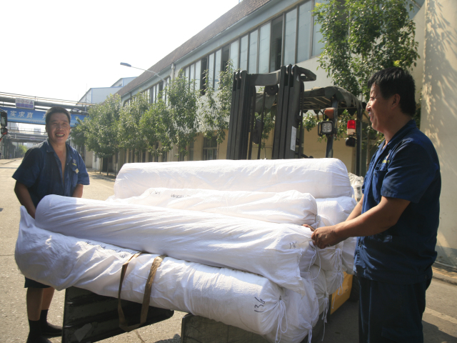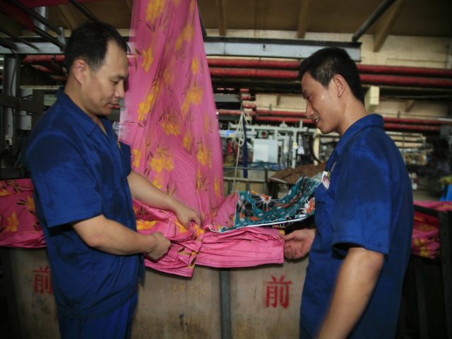 家纺车间前处理340丝光机出检工李娟(图左)与前来推布的360拉幅机进检工朱涛交接产品。李娟说:“天气越热,我们越要互相提示,注重细节,保证安全,保证品质。”