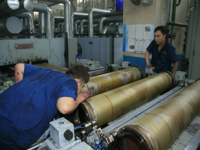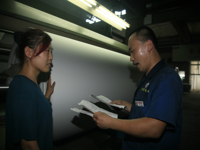 花一车间后处理技术员张延军(图右)与轧光机机长吴秀祝在交流生产情况。他俩表示,每一米优质产品都是靠专注认真干出来的。