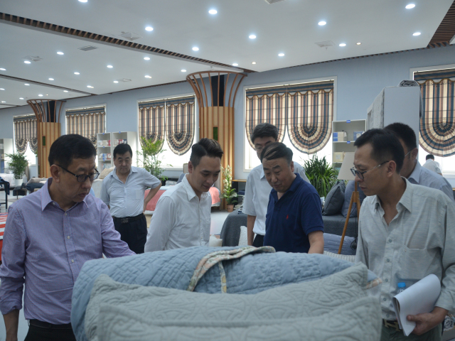 近日,美国某知名公司总经理冯海帆、产品发展部经理谭旭辉、产品销售部经理邵嘉琪一行来公司参观考察。公司董事长王力民陪同客人参观了花布二车间、花布制版、家纺展厅、智能立体化仓库、工程技术研究院、创意中心等处。