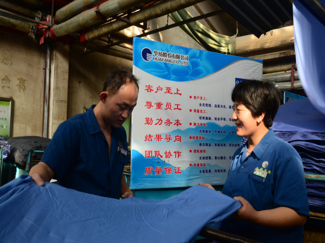 图为面二车间甲班4#水洗机机长刘学涛(左)在与出检工张海燕查看下机产品的质量情况。
