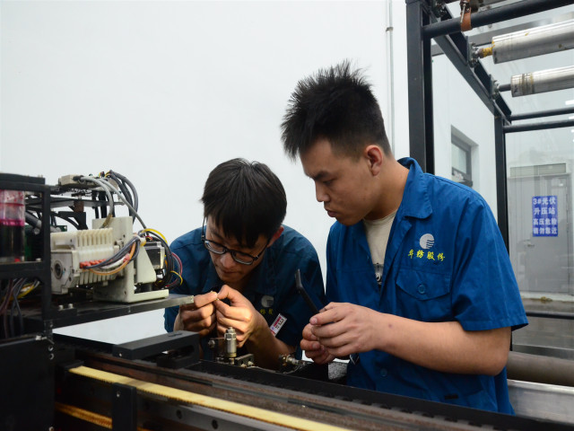 图为家纺车间吕鹏廷(左)与尹广涛在修复光栅读头。