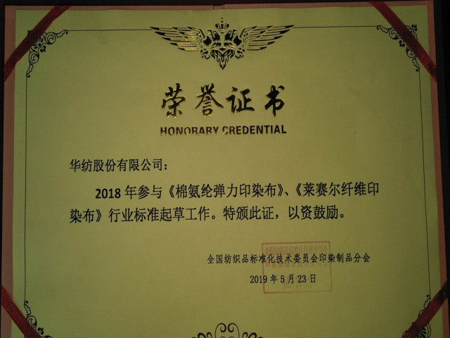 2018年,公司标准化团队第1位主导完成了《莱赛尔纤维印染布》和《棉氨纶弹力印染布》两项行业标准的修订,并荣登全国纺织品标准化技术委员会印染制品分技术委员会2018年度“标准起草单位荣誉榜”。日前,公司标准化专业人员刚刚完成承担的第1位主导修订的《锦纶与棉交织印染布》审稿工作,预计2020年上半年发布实施。